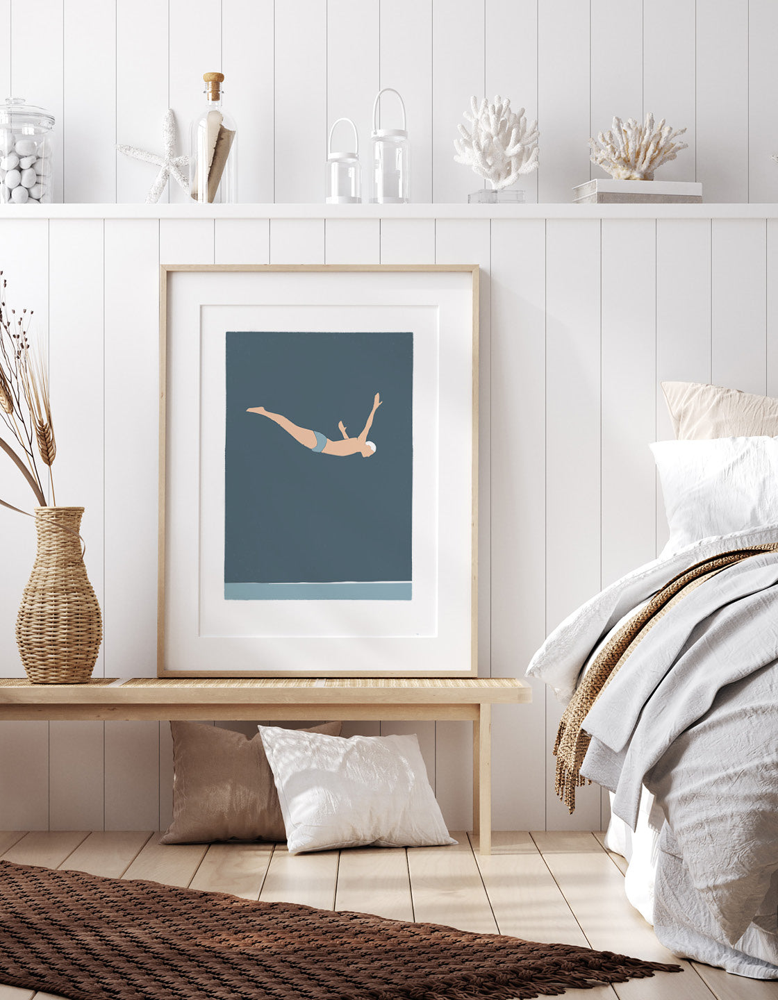 Dive into the world of modern graphic art with this stunning minimalistic print featuring a diver in action. The simplicity of the design and bold blue hues create a peaceful and serene atmosphere that will elevate any room.