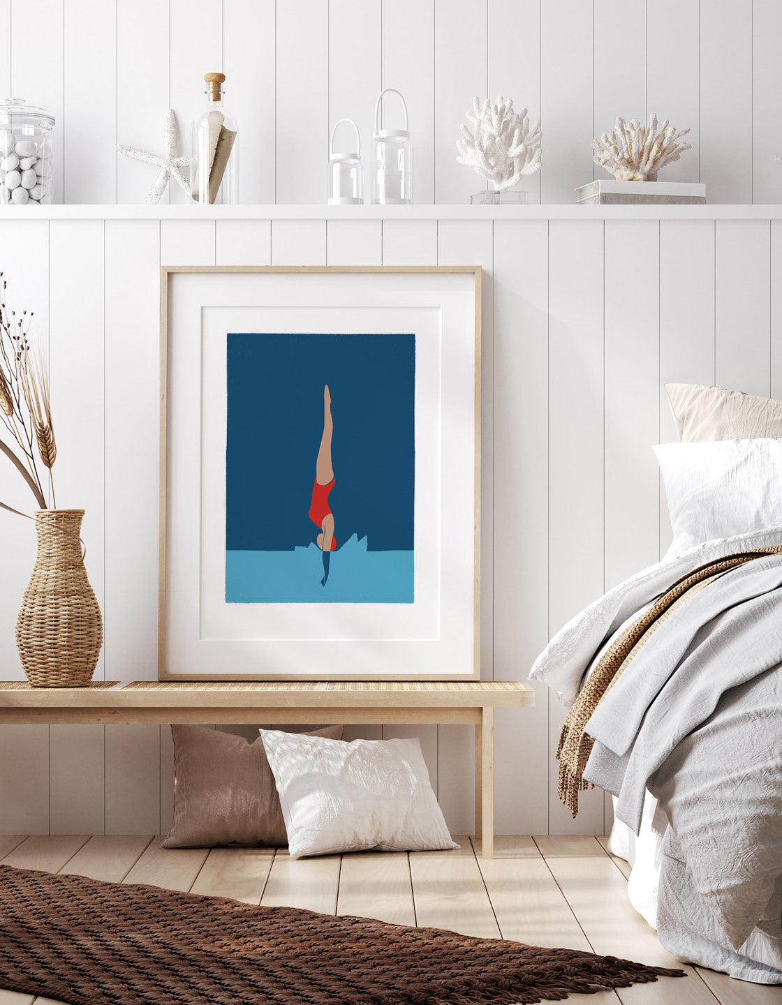 One of our original minimal diving girl art deco style prints. This woman making a splash is perfect for adding charm to your bathroom or downstairs toilet decor and is also available in a set of 3.