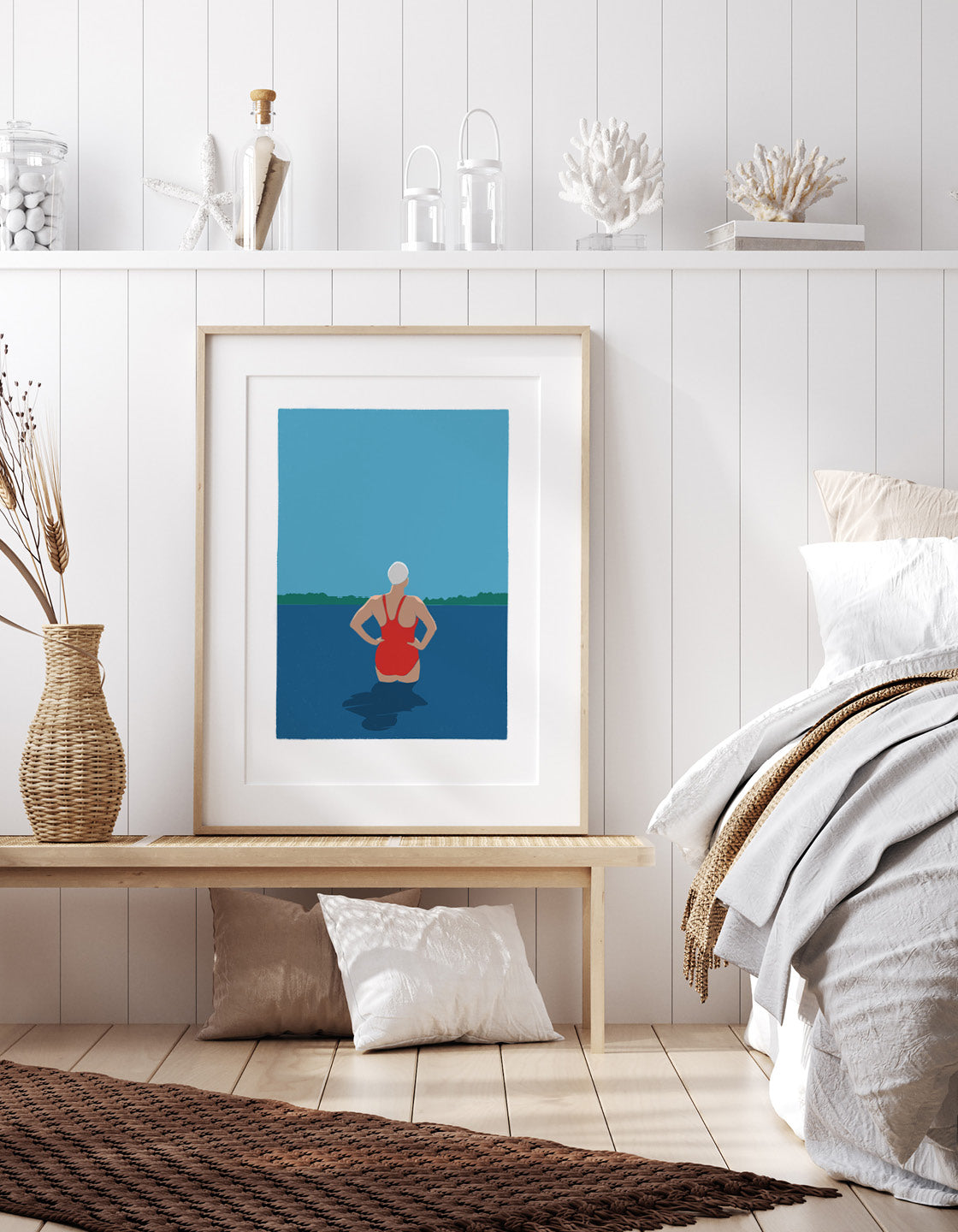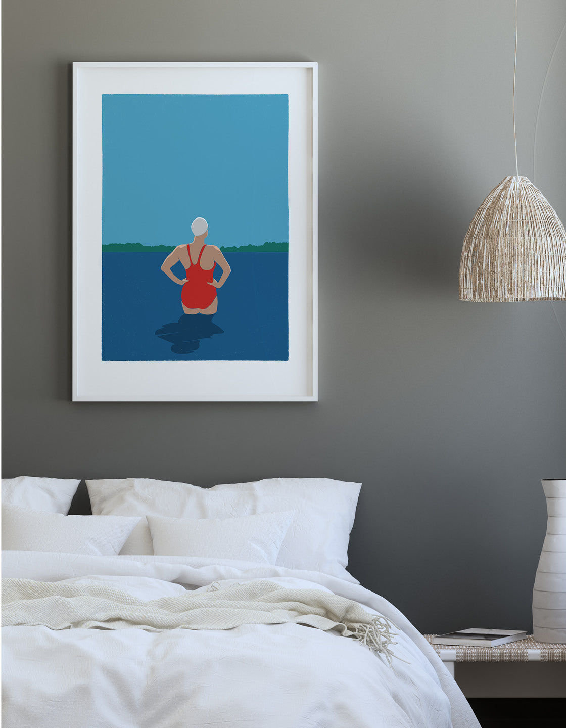 Celebrate your love of wild swimming with this chic and modern art print – the bold coloured minimalistic design features a woman getting ready to take a plunge into the beauty of nature all around her.
